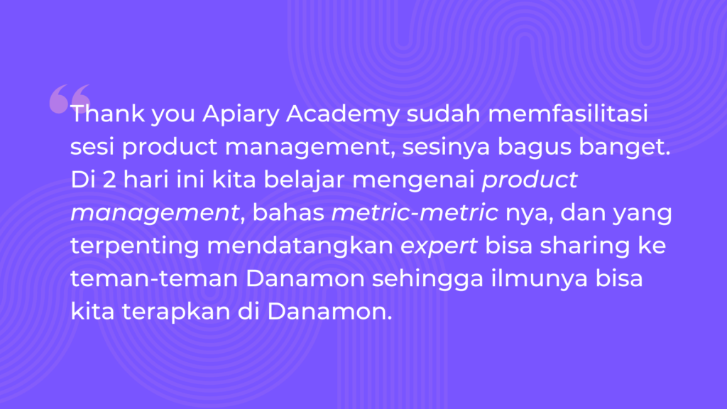 Bank Danamon menghadapi tantangan signifikan dalam meningkatkan kemampuan manajemen produk timnya, terutama terkait pengembangan produk, riset produk, dan pemahaman metrik yang tepat. Selain itu, adanya kesenjangan pengetahuan diantara anggota tim produk yang menjadi perhatian utama. Untuk itu, Danamon memilih Apiary Academy sebagai mitra training karena pendekatan praktis dan relevan yang ditawarkan, serta pengalaman Apiary dalam membantu perusahaan besar mengatasi tantangan serupa.