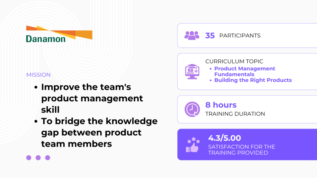 Setelah mengikuti sesi training, tim Bank Danamon mendapatkan hasil yang nyata:- Peningkatan Keterampilan Manajemen Produk: Tim produk kini lebih mampu menyusun strategi dan mengelola roadmap produk dengan lebih baik.