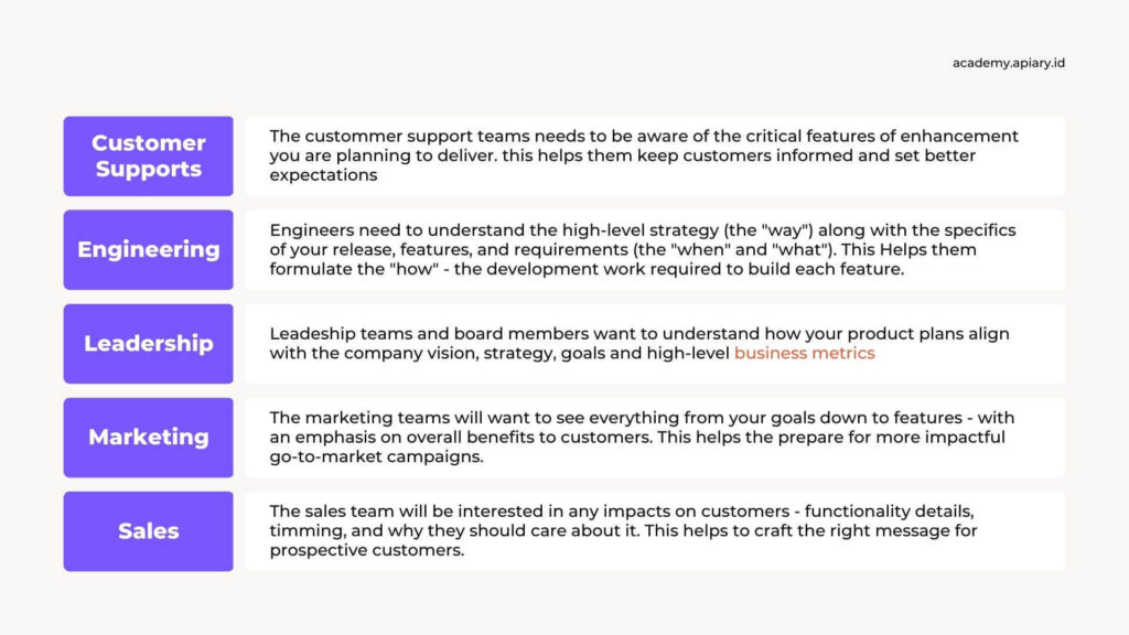 Product Roadmap ini sangat penting karena akan selalu dibutuhkan untuk team lain menentukan berbagai macam hal. Berikut beberapa contoh penggunaan Product Roadmap: