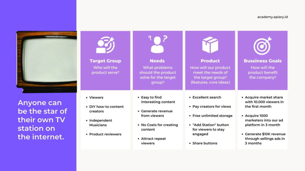- Untuk menjawab kebutuhan dari target kelompok, produk yang akan dibuat memiliki beberapa spesifikasi yaitu: mesin pencari yang bagus, kreator dibayar per tontonan, kapasitas penyimpanan tak terhingga, tombol “add station” agar penonton bisa mengikuti konten dari kreator secara uptodate, dan tombol “share” untuk membagikan konten kepada orang lain
