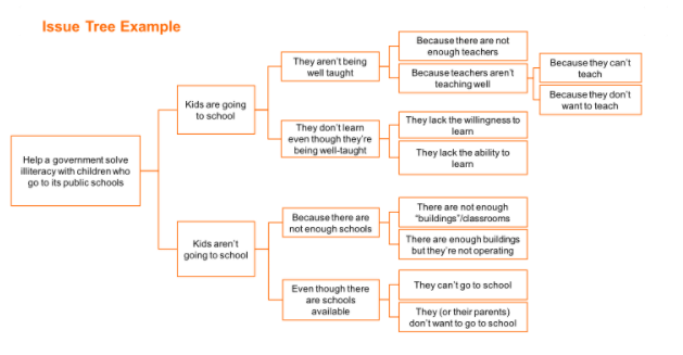 Misalkan Anda sebagai konsultan manajemen dan pemerintah meminta bantuan Anda untuk menyelesaikan permasalahan literasi pada usia anak-anak. Pertama Anda memahami permasalahan tersebut dan kemudian break down masalah menjadi komponen terkecil. Pada akhirnya Anda menemukan berbagai kemungkinan mengapa permasalahan literasi pada usia anak-anak antara lain: